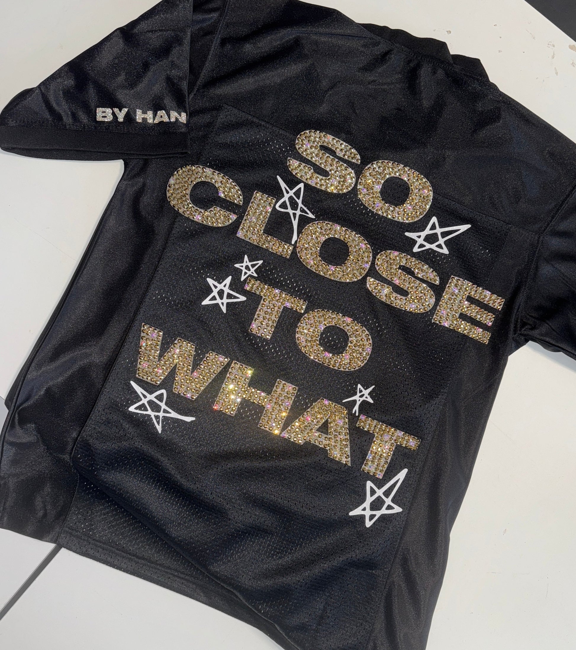 Football mesh jersey detailed with Tate Mcrae details. Rhinestoned "TATE" on the front, "So Close To What" on the back with her iconic hand drawn stars added throughout.